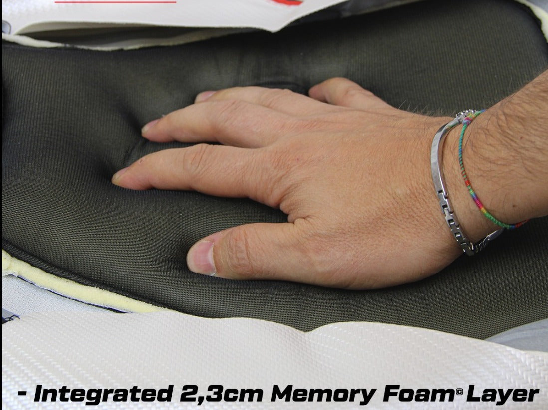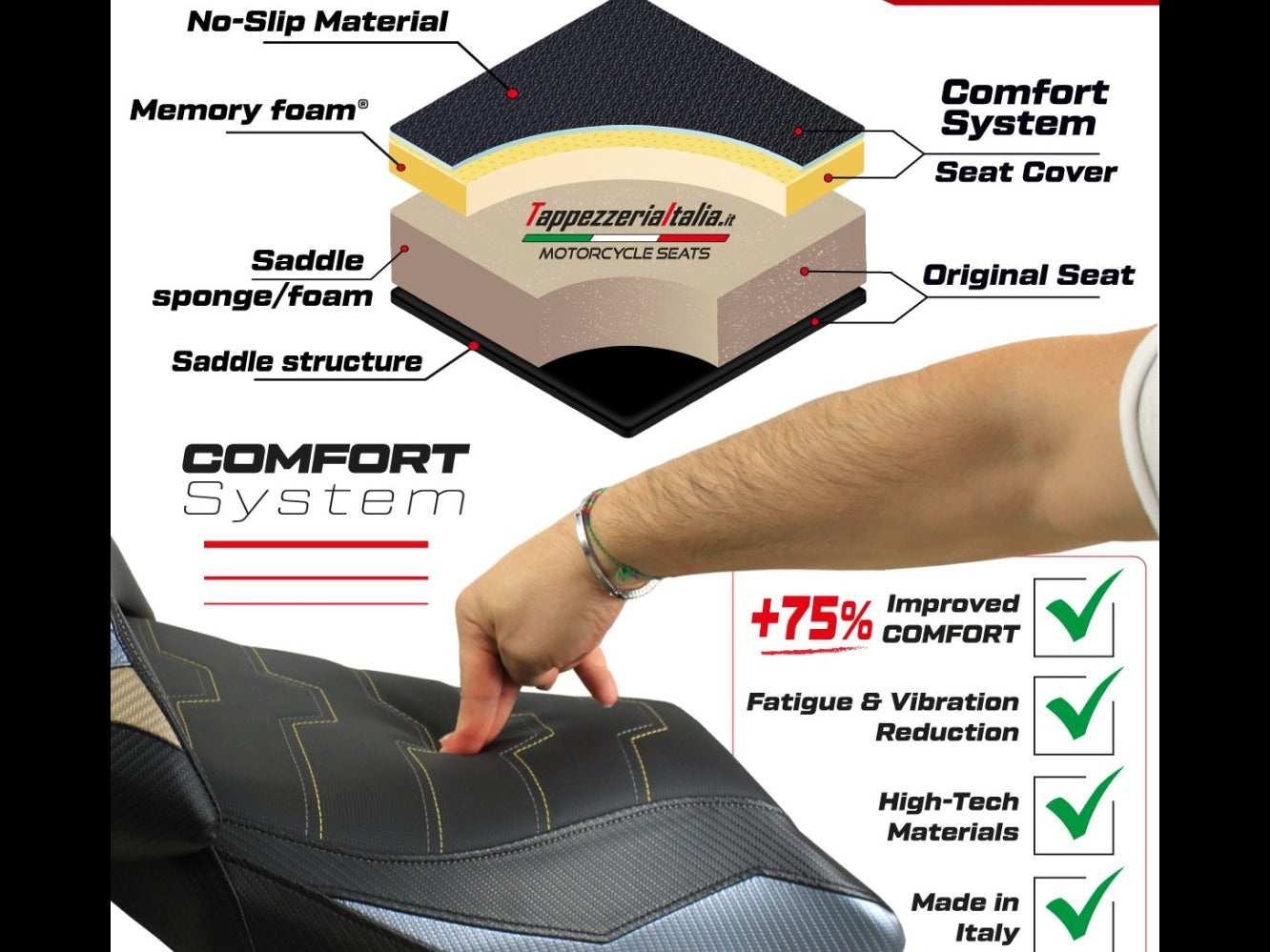 The Comfort System by Tappezzeria Italia is an exclusive technology developed to enhance riding comfort and reduce fatigue for both rider and passenger, especially on long journeys.