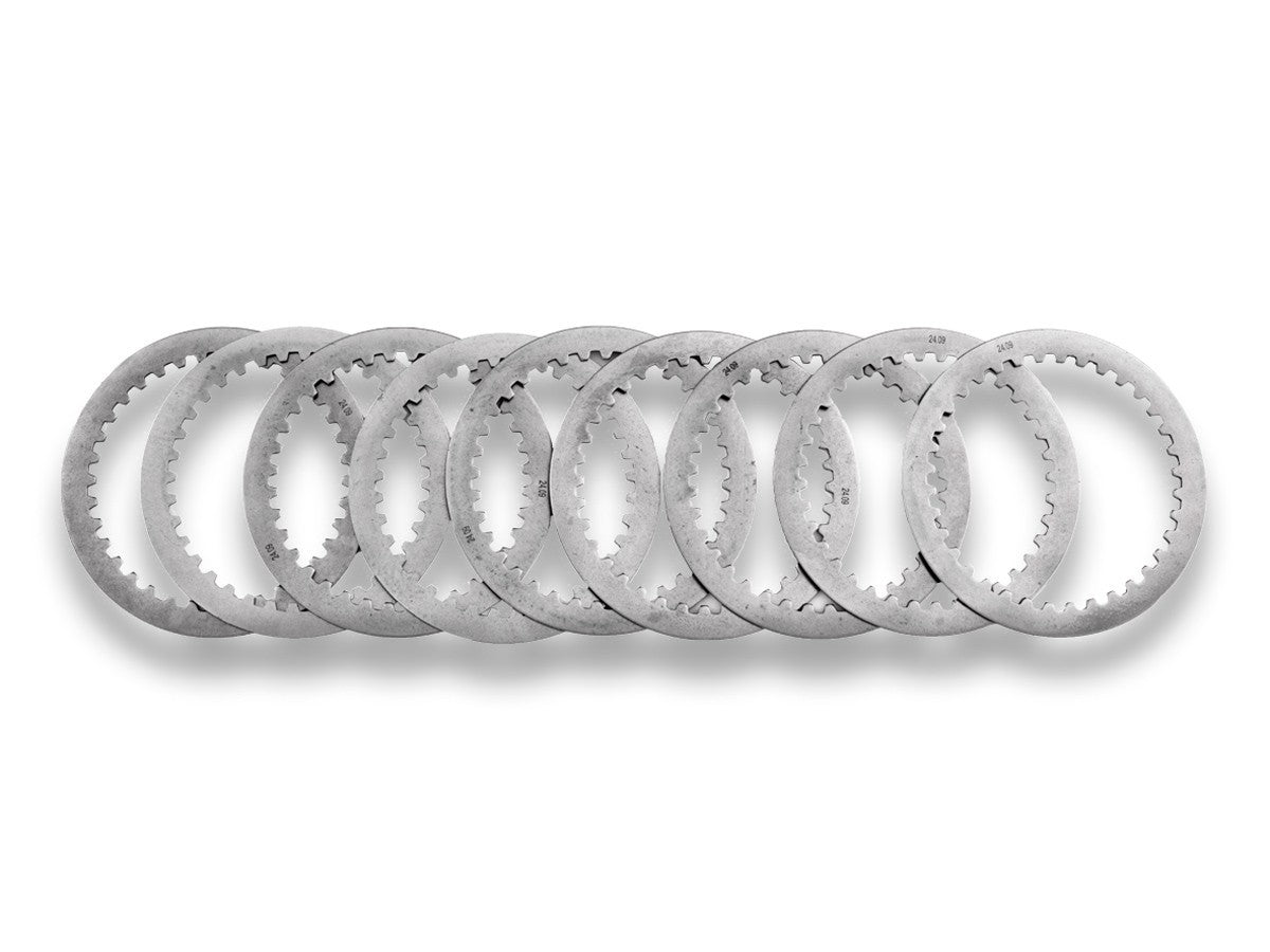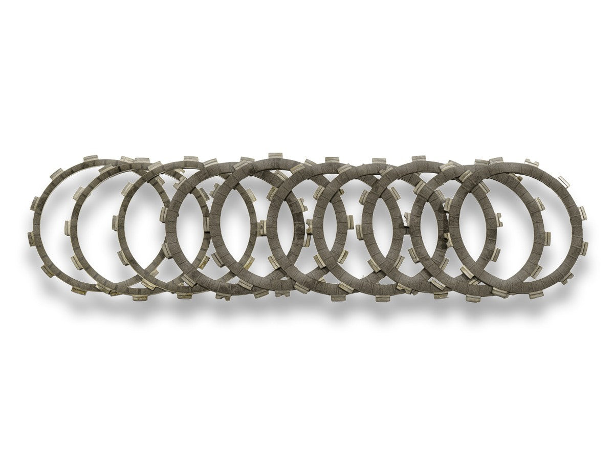 Clutch disc kit featuring aluminum-supported friction discs and high-performance steel plain discs. The friction material provides superior characteristics compared to OEM stock discs, ensuring greater durability, enhanced performance, and a more responsive feel in all riding conditions.