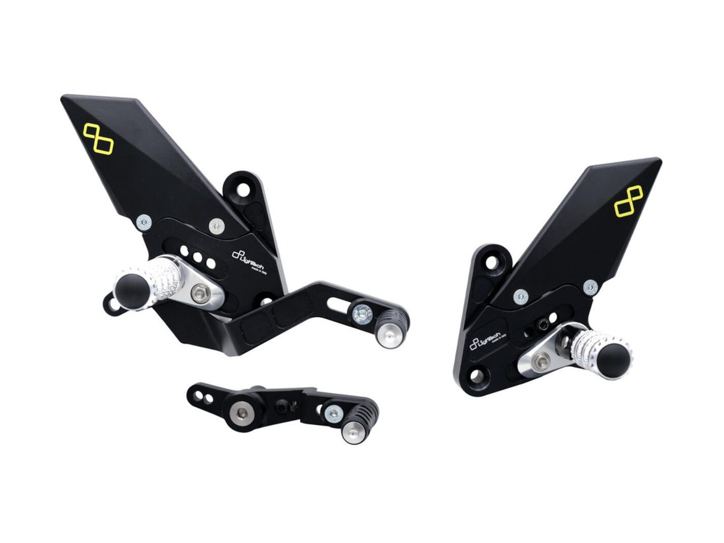 They are adjustable in height and backwards, offering multiple footpeg positions, which can be implemented with the aid of optional footpeg holders. Up to 3 high-quality bearings are integrated into the levers to withstand the most extreme stresses on the road, but especially on the track.