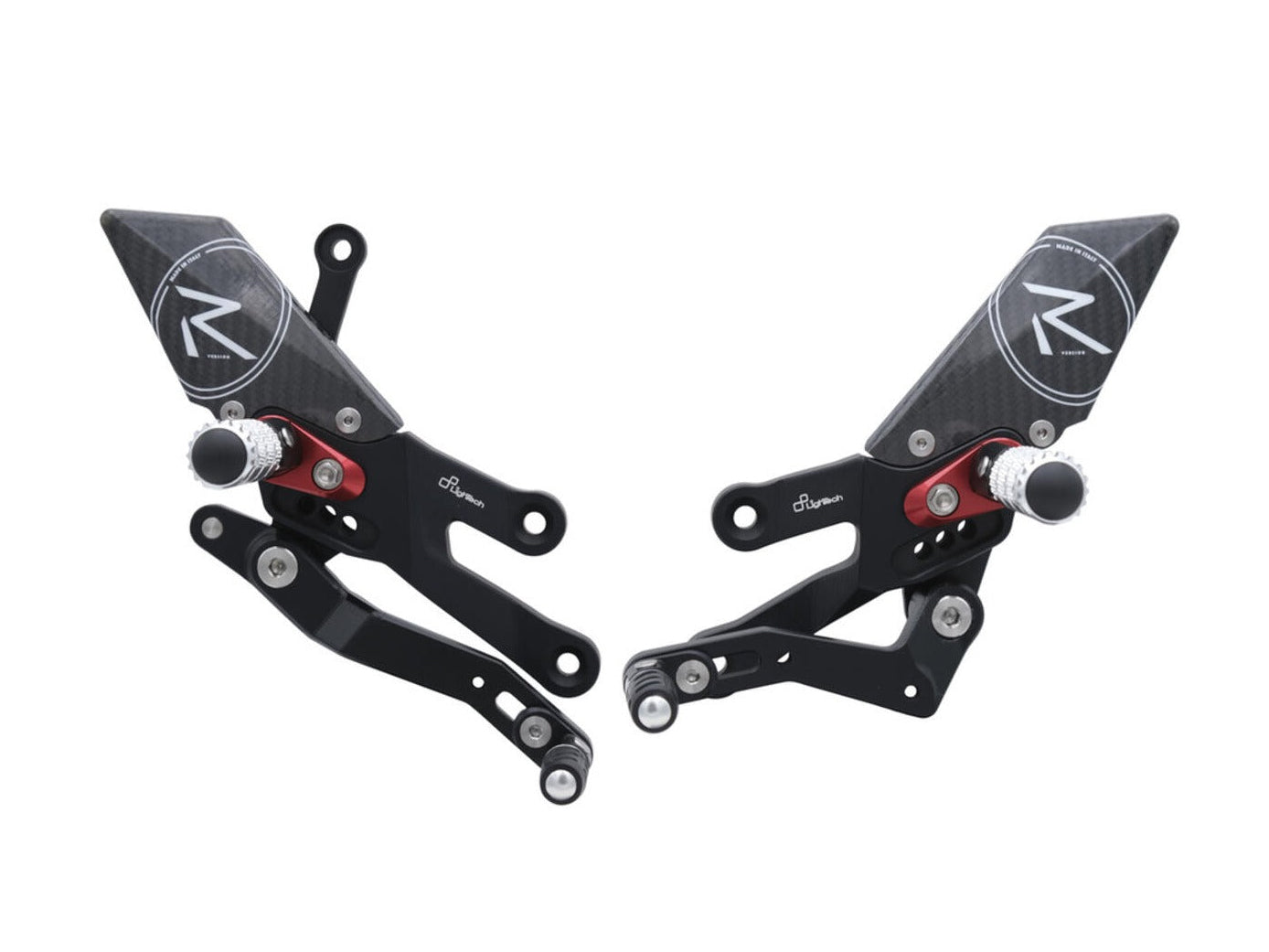 The ""R"" rearset is equipped with folding silver footpegs and toe-pegs, carbon heel guards, titanium bolts and red footpeg supports.